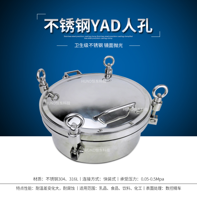 产品详情:产品称呼:保健不锈钢YAD压力型开口和向外型人孔盖用于压力罐和容器。容器的顶部通向容器的内部,右侧则是封闭的。此人孔盖构造的内径为:等。用于人孔盖的材质为l。开启构造,开启便捷,安全实用,外形美观。有椭圆形,圆形,方形和0.05-0.5mpa的承受压力。材质为SUS或susl。
