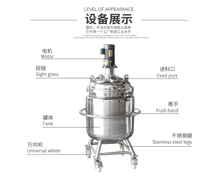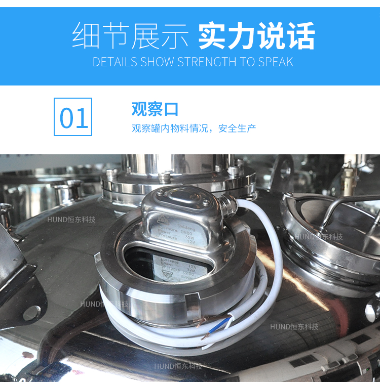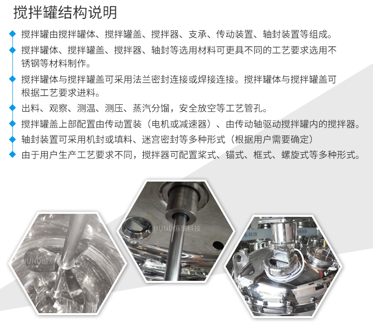 附加装置:搅拌器,检修孔,物料进出口,介质进出口,观察镜,防尘孔,温度计,进样阀,液位传感仪等,可根据客户要求展开配置。